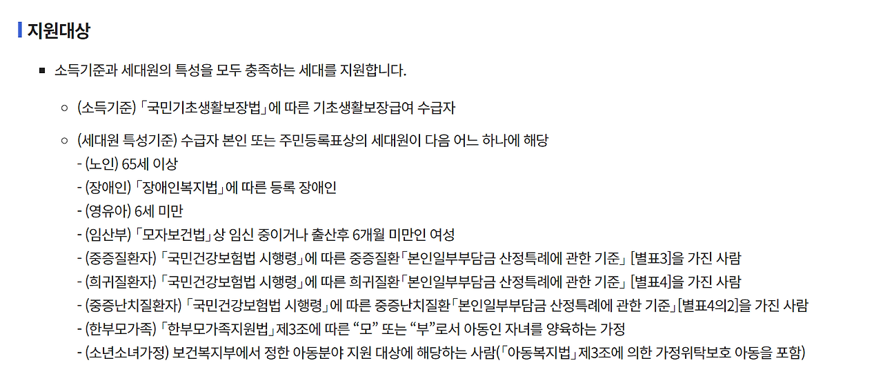 2. 세대원 : 수급자 또는 세대원이 65세 이상 어르신, 7세 이하 영유아, 장애인, 임산부, 중증/희귀/중중난치질환자. 한부모가족, 소년소녀가장 중 하나에 해당 할 경우