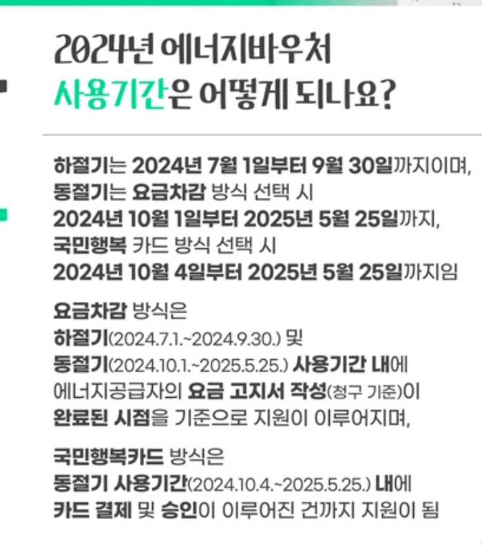 하절기바우처의 사용기간은 7월 1일(월) ~ 9월 30일(월)까지 전기만 가능하며, 동절기바우처의 경우 10월 1일(화) ~ 5월 25일(일)까지 전기, 도시가스, 지역난방 중 한가지만 사용이 가능합니다. 실물 카드의 경우 10월 4일(금) ~ 5월 25일(일)까지 전기, 도시가스, 등유, LPG, 연탄 사용이 가능합니다.