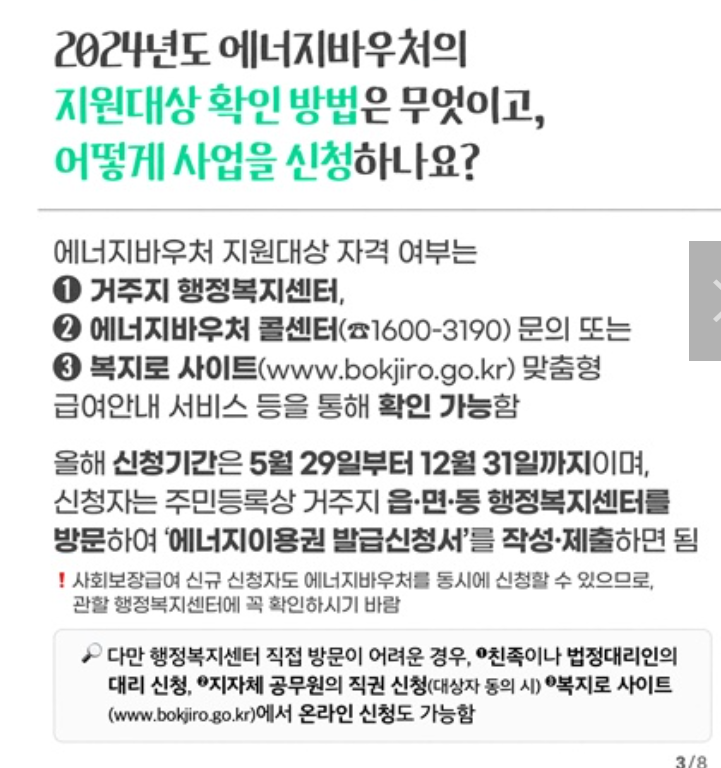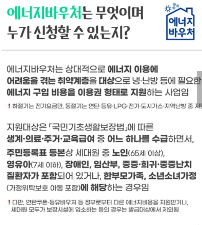에너지바우처 신청 대상자는 전기 및 가스, 난방 등 에너지 이용에 어려움을 겪는 취약계층을 상대로 냉/난방비를 지원하는 사업입니다.