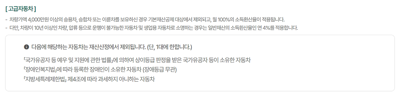 그리고 고급자동차의 기준은 배기량 3,000cc 이상 또는 차량가액 4천만원이상 승용차는 100% 소득으로 산정되는데요, 단, 차령이 10년 이상인 차랑이거나 생업용 자동차로 소명하는 경우에는 고급자동차에 대한 산정에서 제외됩니다. 또한 골프회원권, 승마회원권, 콘도회원권 등도 공제되는 금액 없이 금액 그대로 재산에 포함됩니다.