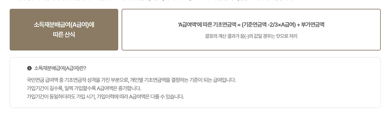 국민연금 금액에 따라 차감되는 기초연금액은 본인의 소득재분배급여인 A급여에 따라 차감되기에 개인마다 다릅니다. A급여란 국민연금 급여액 중 기초연금적 성격을 가진 부분으로 개인별 기초연금액을 결정하는 기준이 되는 급여입니다. 국민연금 가입기간이 길수록, 일찍 가입할수록 A급여액은 증가하고 가입기간이 동일하더라도 가입시기와 가입이력에 따라 A급여액은 다르게 산정됩니다.
