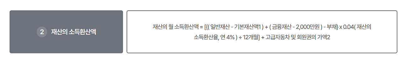 금융재산의 경우 주식, 채권 등을 이야기하며 여기에 기본 공제로 2천만원을 공제해줍니다. 이렇게 계산 된 가구의 일반재산과 금융재산에서 부채를 차감합니다. 그럼 이제 이 금액이 본인의 재산이 되는데요, 여기에 재산의 소득환산율인 0.04%를 곱하고 여기에 12로 나누면 재산의 월소득 환산액이 계산됩니다.
