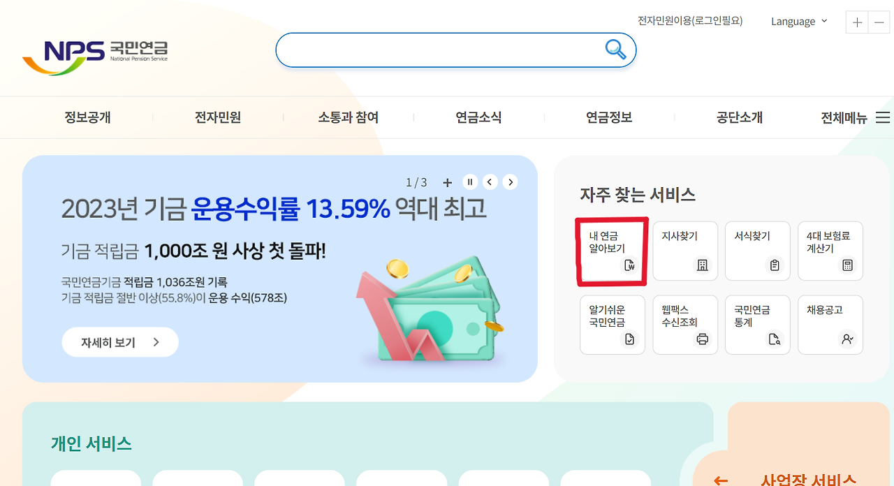 먼저 국민연금 홈페이지에 접속하여 내 연금 알아보기 탭을 눌러줍니다.