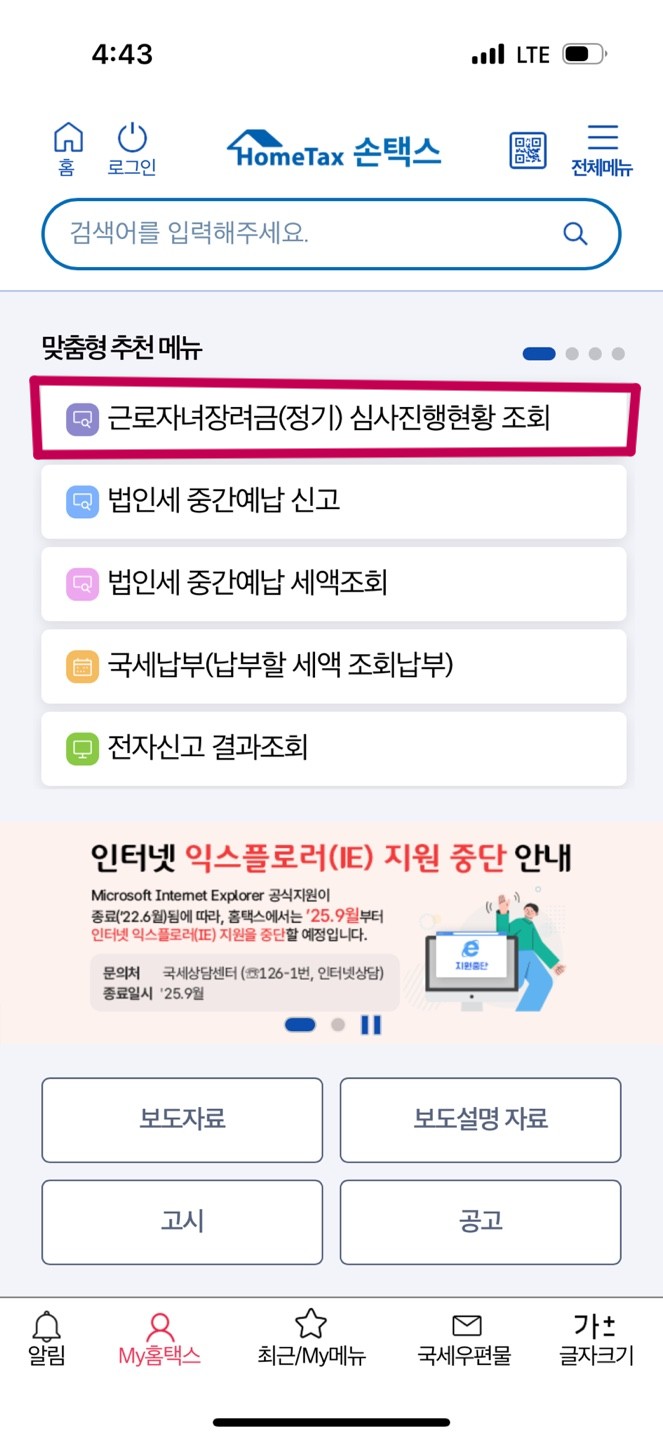 2. 근로장려금 정기 심사진행 조회 선택