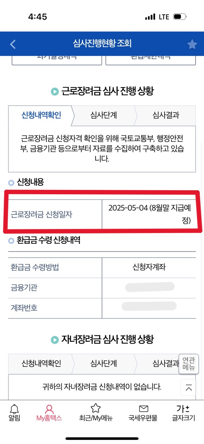 그럼 근로장려금 신청일자 옆 근로장려금 지급일이 나오고 환급금 수령 신청내역에 근로장려금을 받을 계좌번호와 금액을 확인할 수 있습니다. 근로장려금 금액과 정확한 지급일은 8월 11일 이후에 정확한 공지가 나올 것으로 보이니 참고바랍니다.